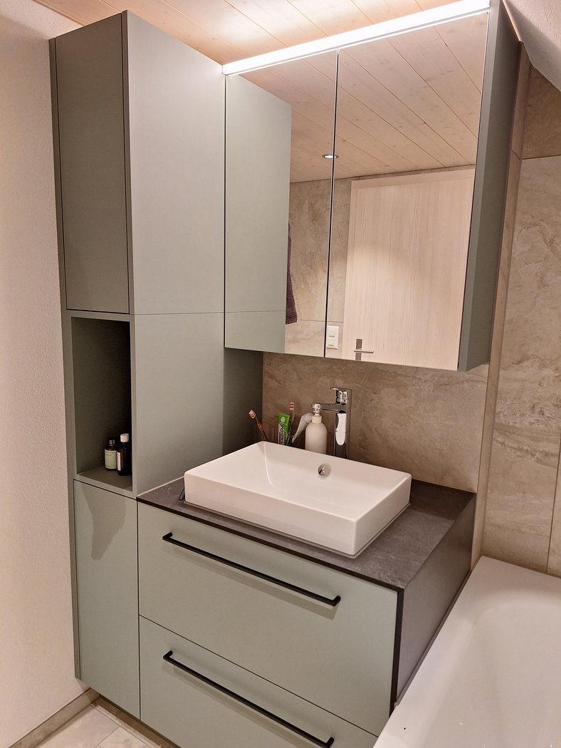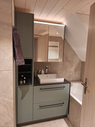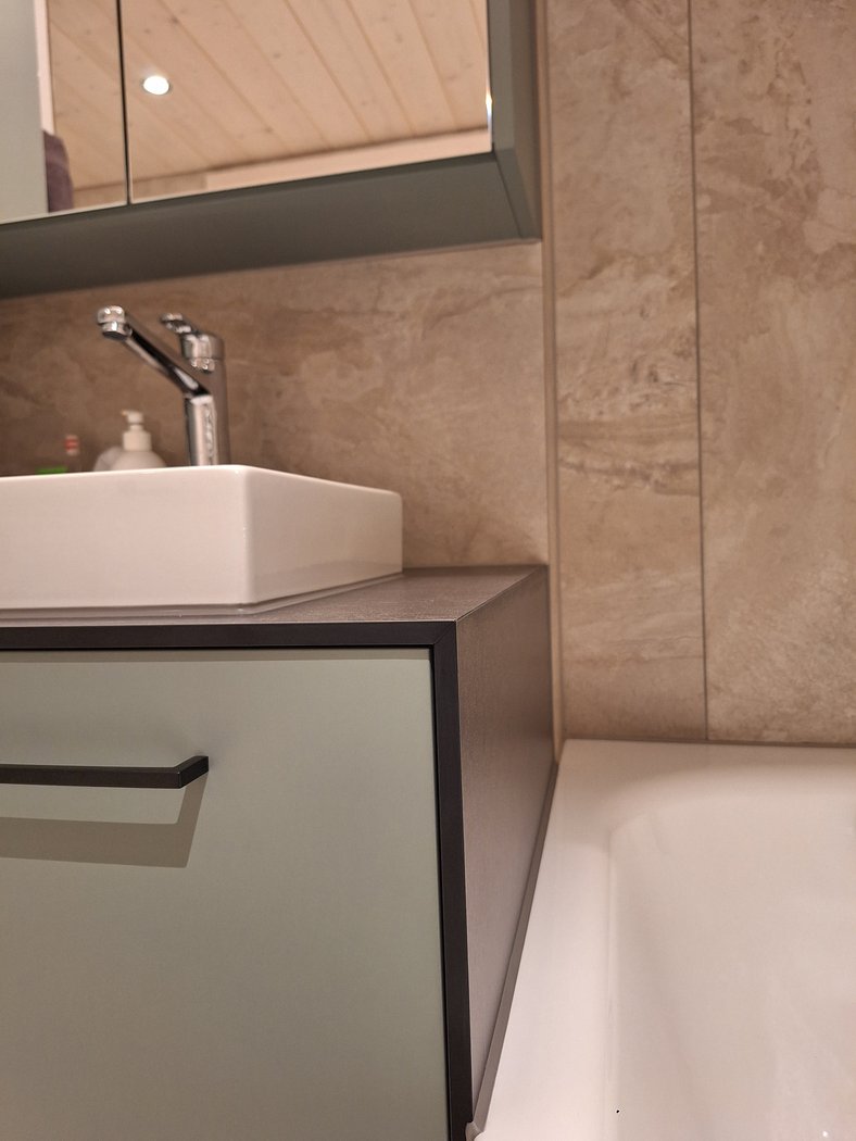 Dank der Vollkernplatte rund um das Badmöbel konnte der Übergang zur Badewanne sauber verfugt werden und ist dadurch zuverlässig wasserbeständig.