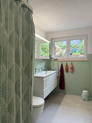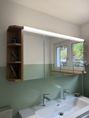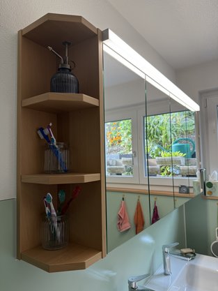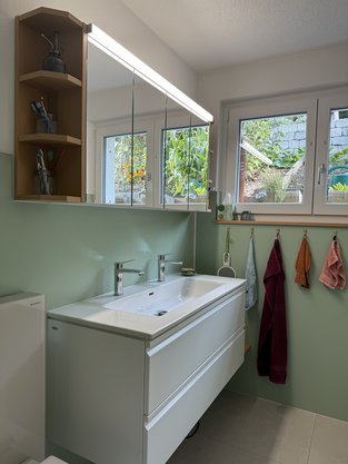 Der helle Farbton der Vollkernplatte in Kombination mit dem breiten Spiegelschrank lässt das Badezimmer freundlich und offen erscheinen.