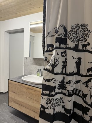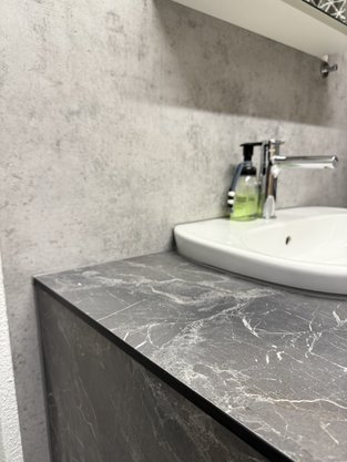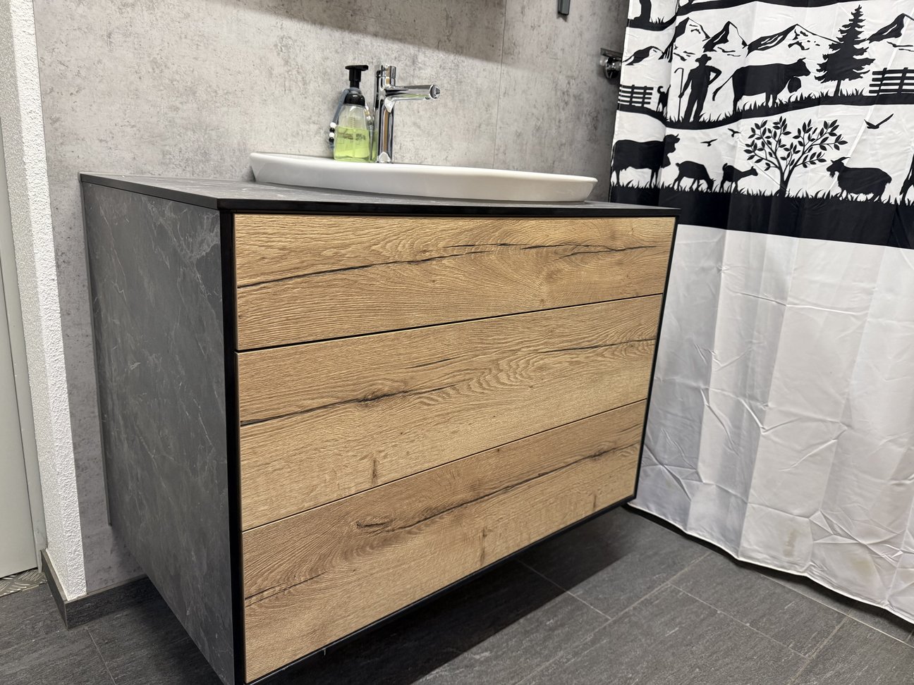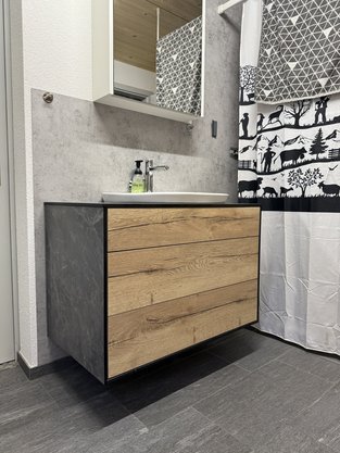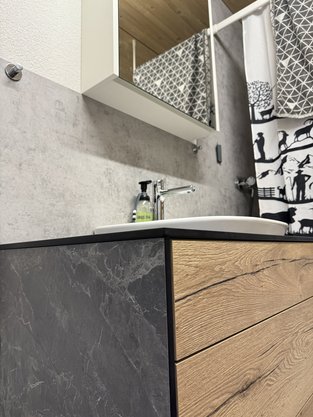 Bei diesem Badezimmer wurden der bestehende Spiegel und das bestehende Waschbecken stilvoll ergänzt und optisch aufgewertet. Das Badmöbel aus Eiche strahlt mit ihrer natürlichen Maserung und den charakteristischen Rissen einen rustikalen Charme aus.