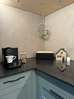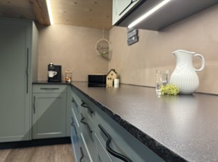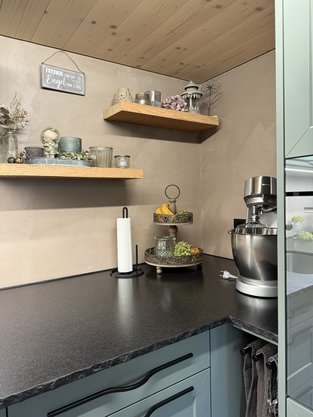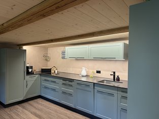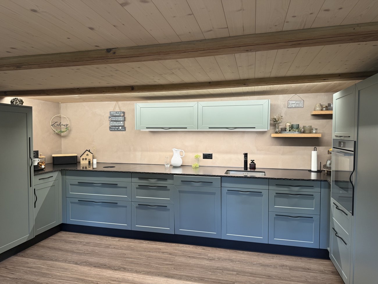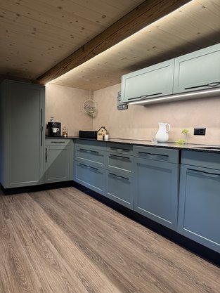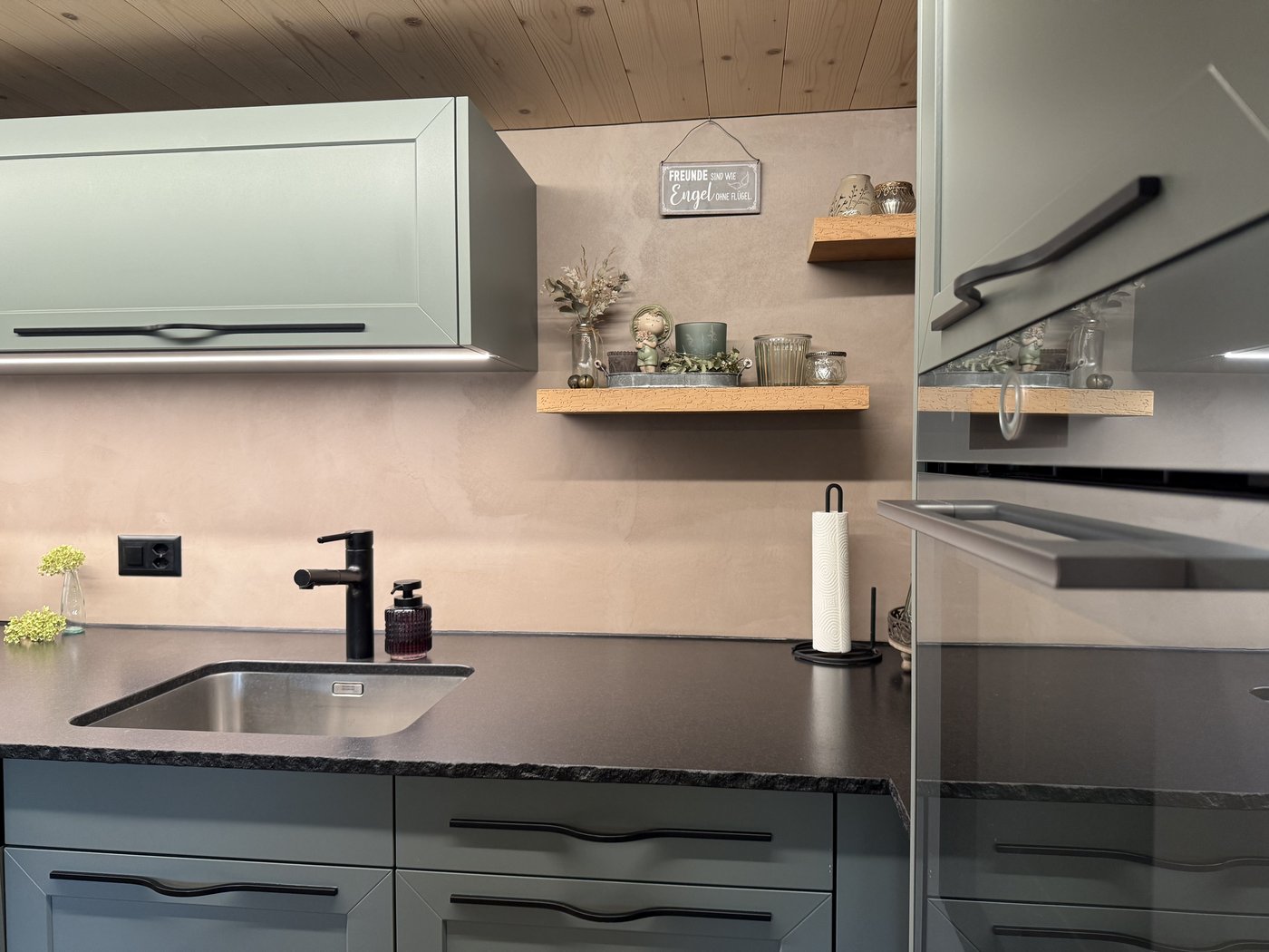 Die Landhausstilküche passt mit der modernen, schilfgrünen Front perfekt in die renovierte Wohnung im Bauernhaus.