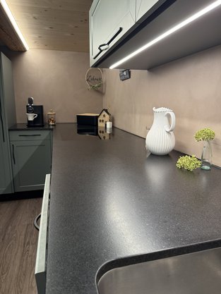 Die Arbeitsplatte, mit den von Hand bearbeiteten Kanten, sorgt für Aufsehen und wirkt extravagant.
