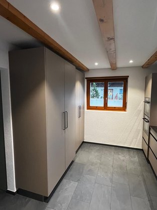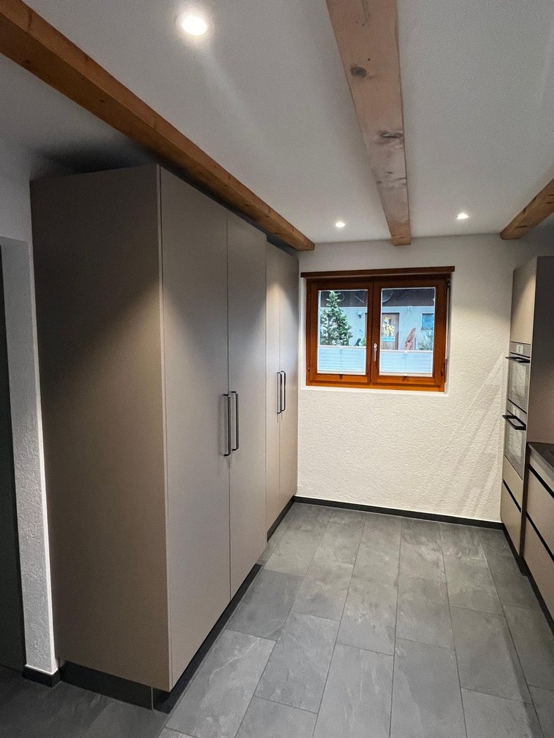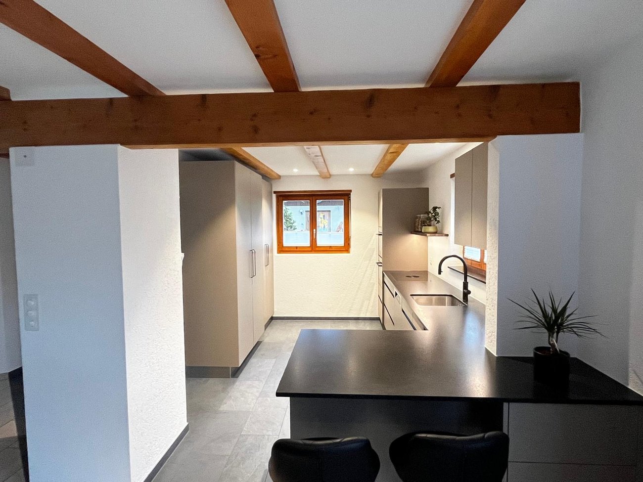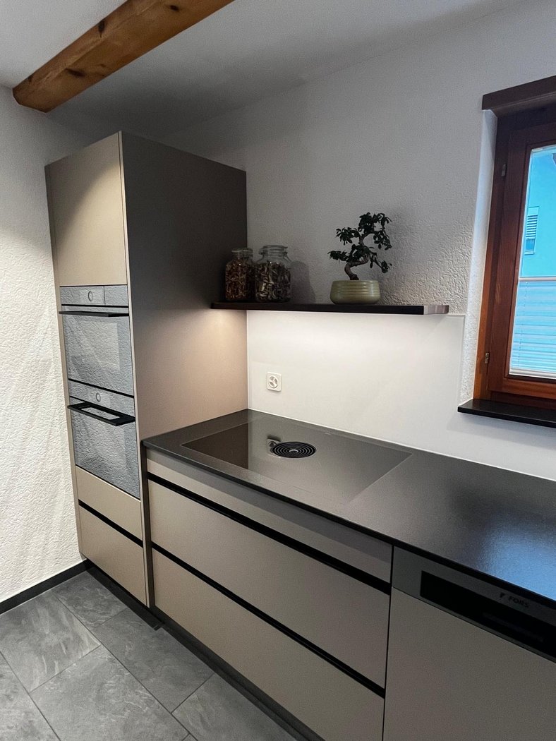 Die Küche im dezenten Braunton ist optisch auf die Holzfenster, die für Tageslicht sorgen, sowie auf die Holzbalken abgestimmt.