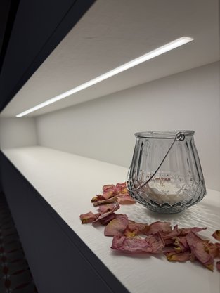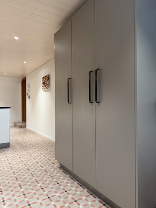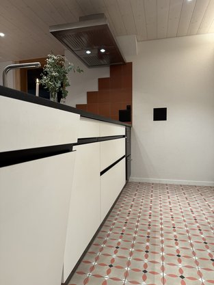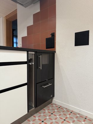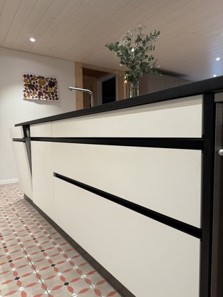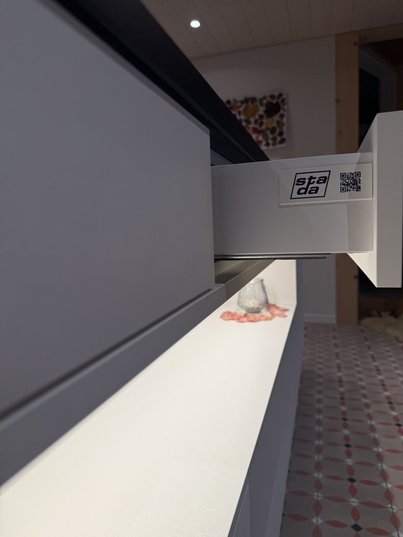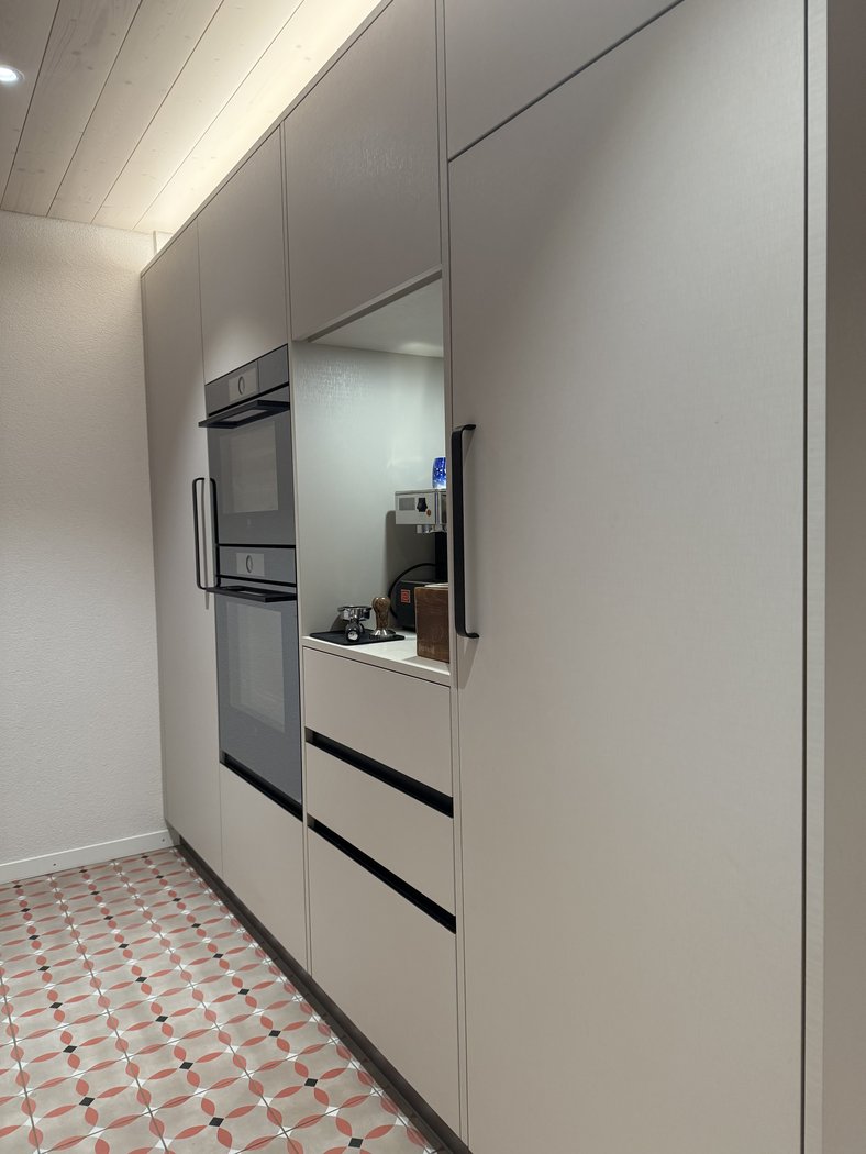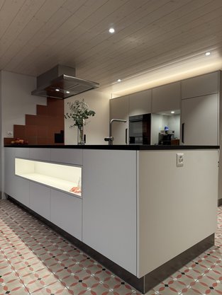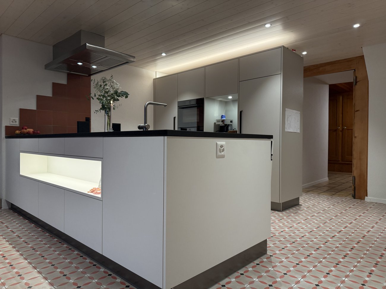 Die Küche zeigt viele weiter Details, wie zum Beispiel eine Nische für die Kaffeemaschine, TipOn Schubladen sowie eine beleuchtete Nische in der Insel.