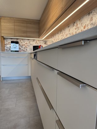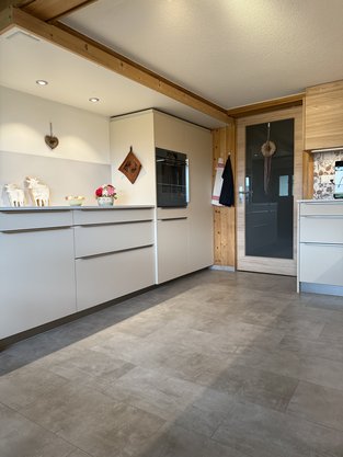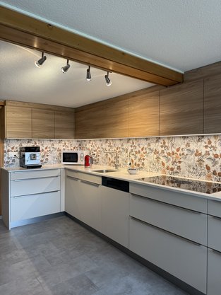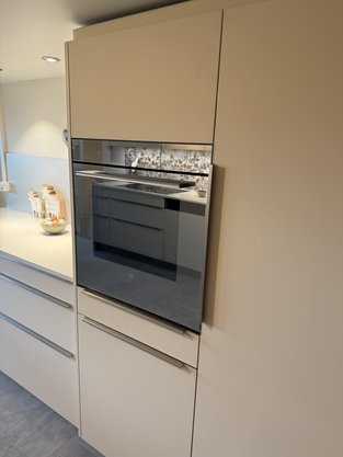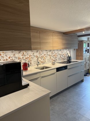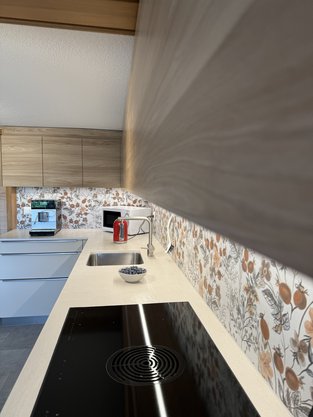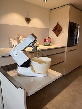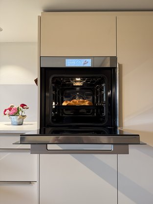 Neben dieser raffinierten Planung überzeugen weitere erwähnenswerte Details: Ein praktisches Hebetablar erleichtert das Backen auf angenehme Weise, der hochwertige CombairSteamer sorgt für luftige Züpfe, und das Gesamtbild der Küche strahlt mit der einzigartigen Rückwand eine warme, einladene Atmosphäre aus.