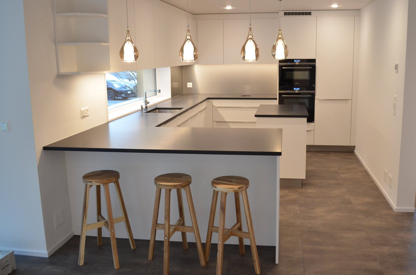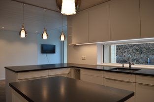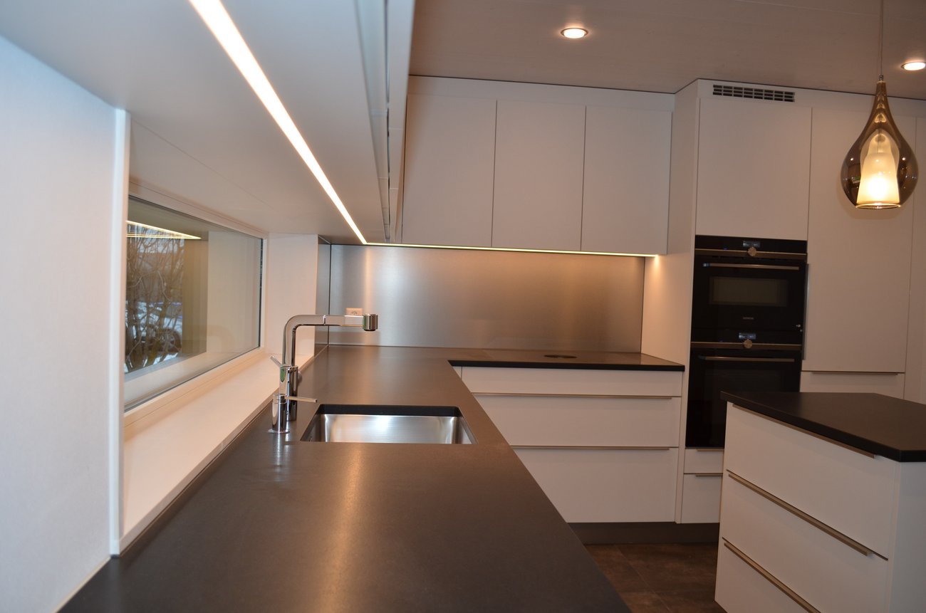 Die U-förmige Küche bietet dank den zahlreichen Oberschränken sowie den geräumigen Schubladen im Unterbau, inklusive Kücheninsel, sehr viel Stauraum.