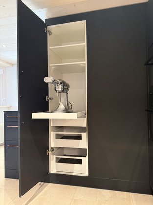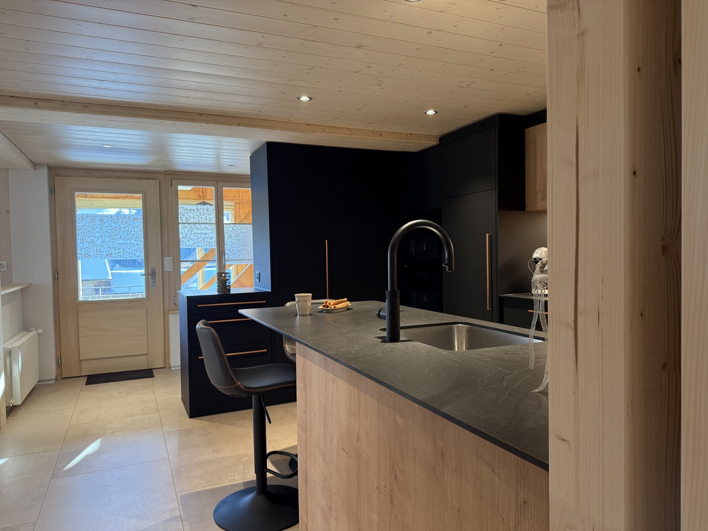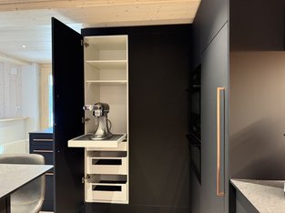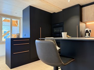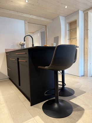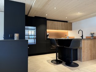 Zum Verweilen lädt die Küche ein - sei es beim Betrachten der in Schwarz und Holzoptik gestaltenen Fronten, beim Entdecken der feinen Innenraumdetails oder bei einer Tasse Kaffee an der Bar.