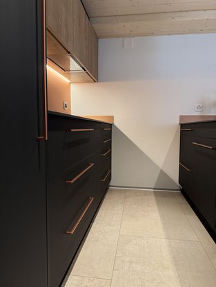 Die schwarze Küche wird durch edle kupfer-roségoldene Möbelgriffe und eine darauf abgestimmte Küchenrückwand zum Blickfang.