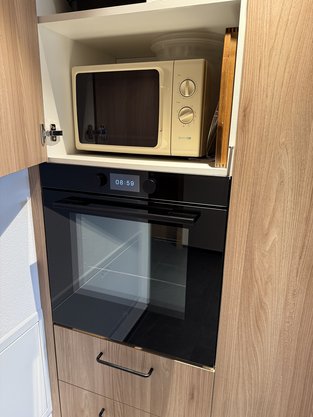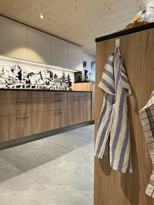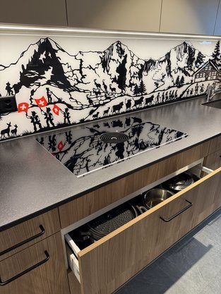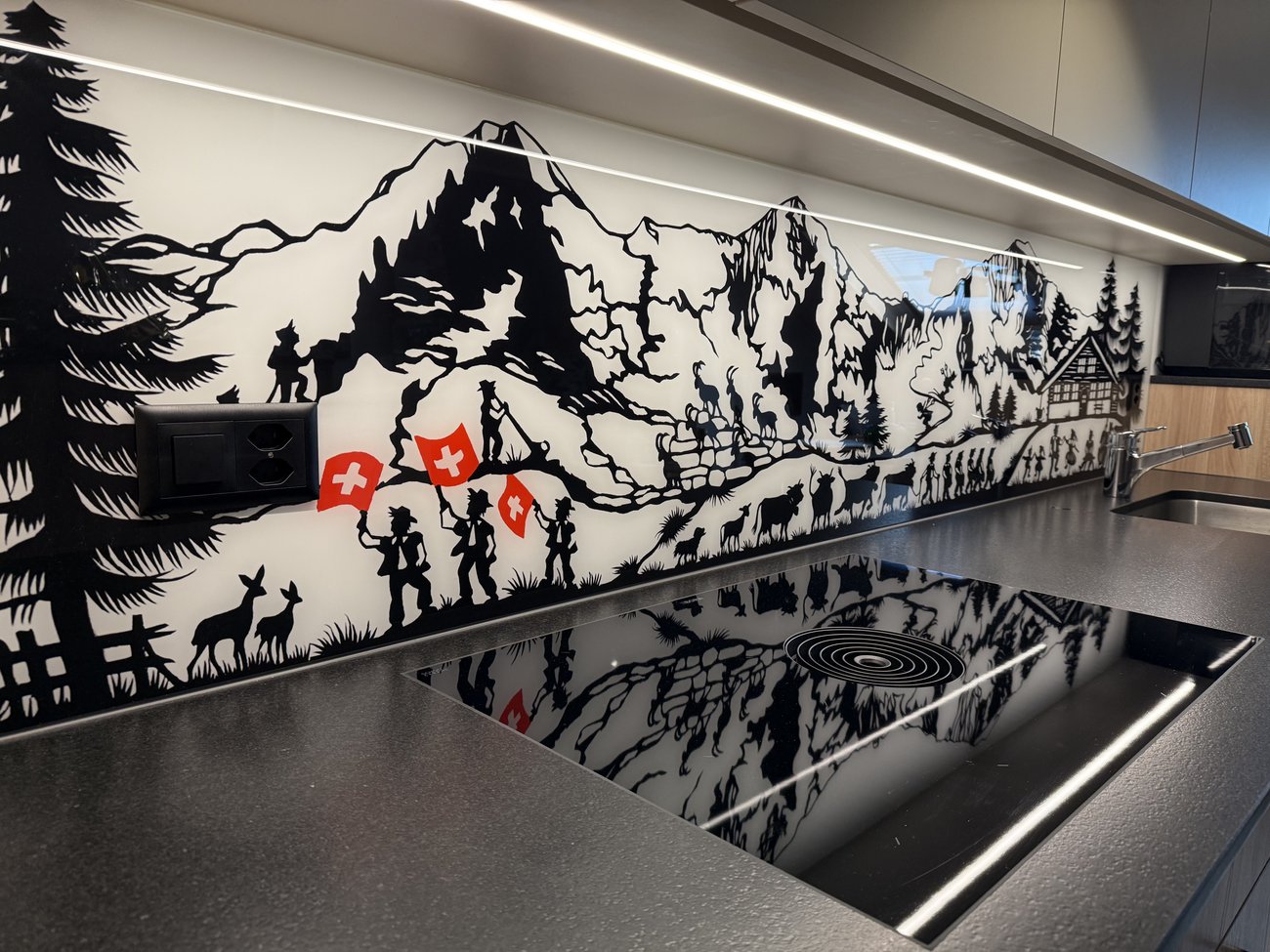 Der Scherenschnitt ist ein klassisches, oft alpines oder folklorisches Motiv, das nostalgische Gemütlichkeit ausstrahlt. in dieser Küche bringt es Wärme und Persönlichkeit, welche sie in vollem Glanz erstrahlen lässt.