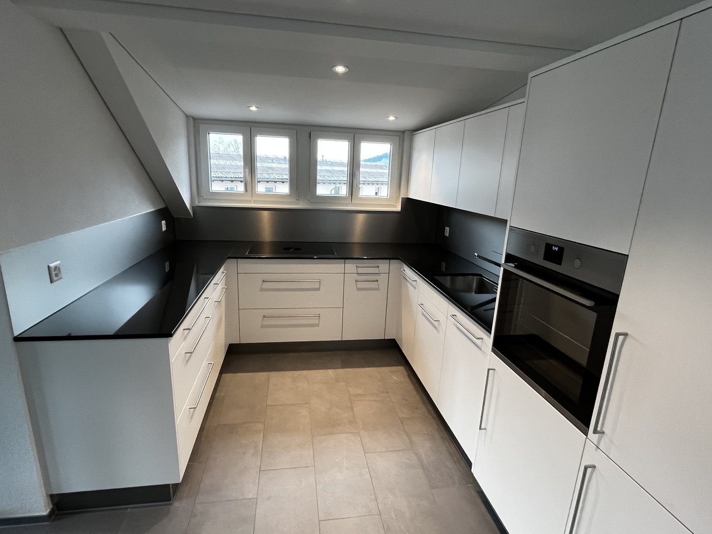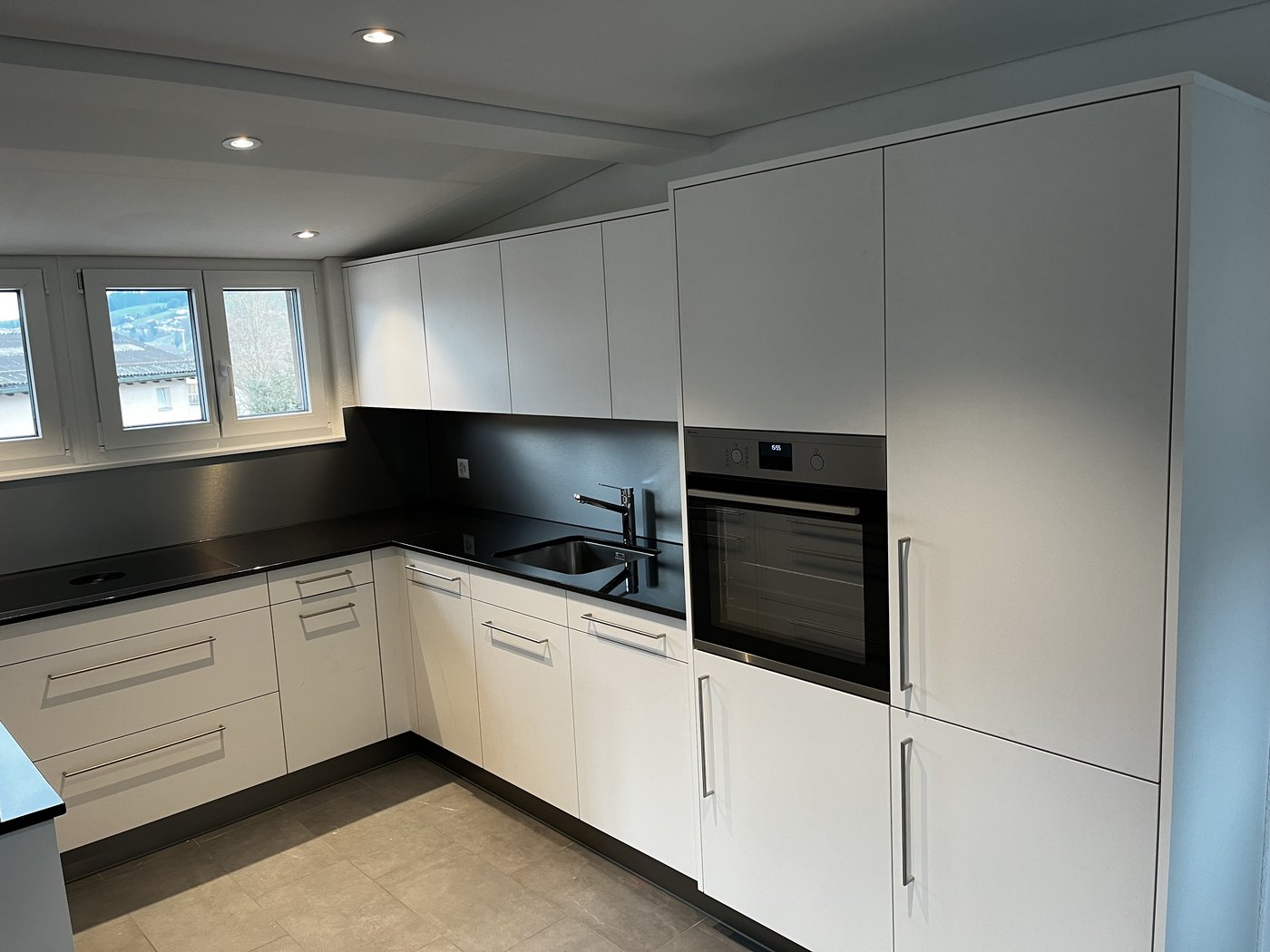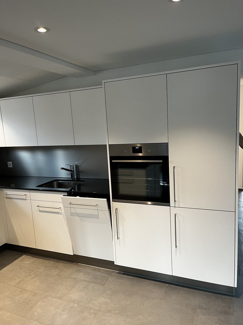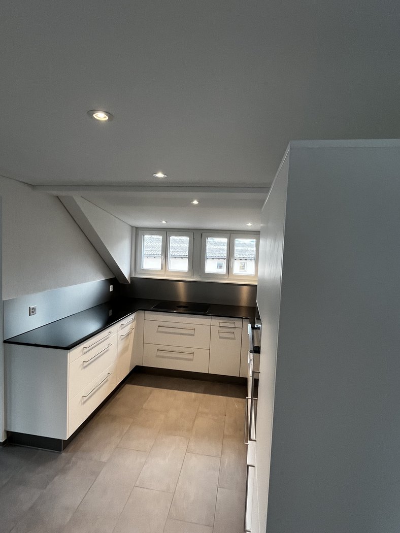 Diese Küche überzeugt trotz der verschiedenen Raumhöhen durch ihre klare Linienführung und zeitlose Schlichtheit.