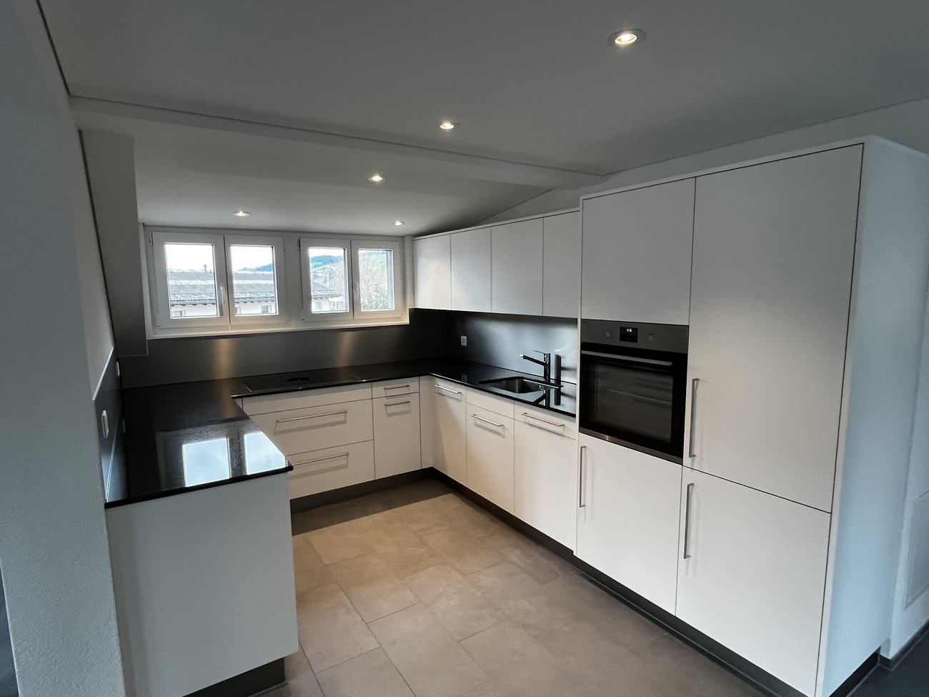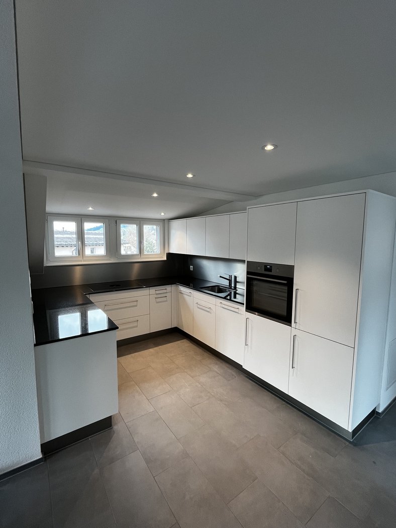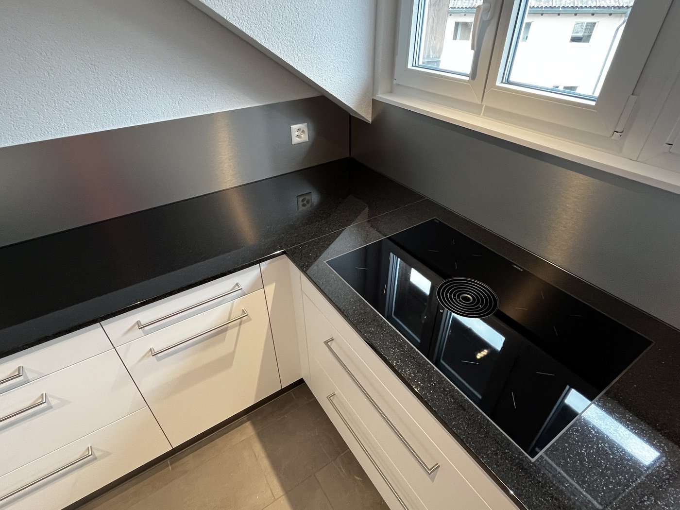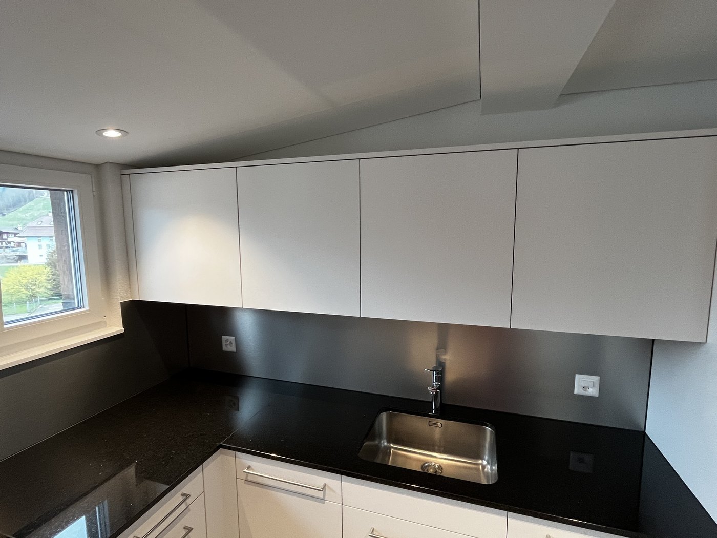 Diese Küche überzeugt trotz der verschiedenen Raumhöhen durch ihre klare Linienführung und zeitlose Schlichtheit.
