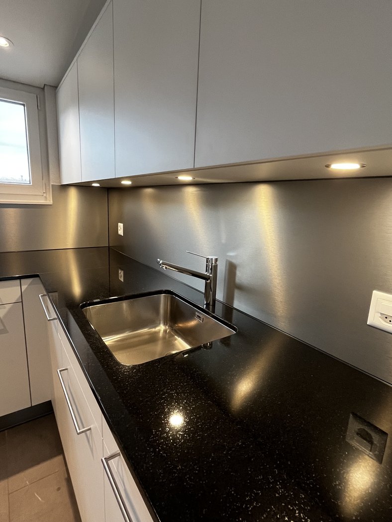 Feine Details wie die polierte Granit-Arbeitsplatte oder die stimmungsvolle, integrierte Beleuchtung verleihen der schlichten Küche Charakter - und machen sie zum stilvollen Mittelpunkt des Wohnens.