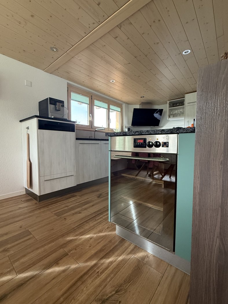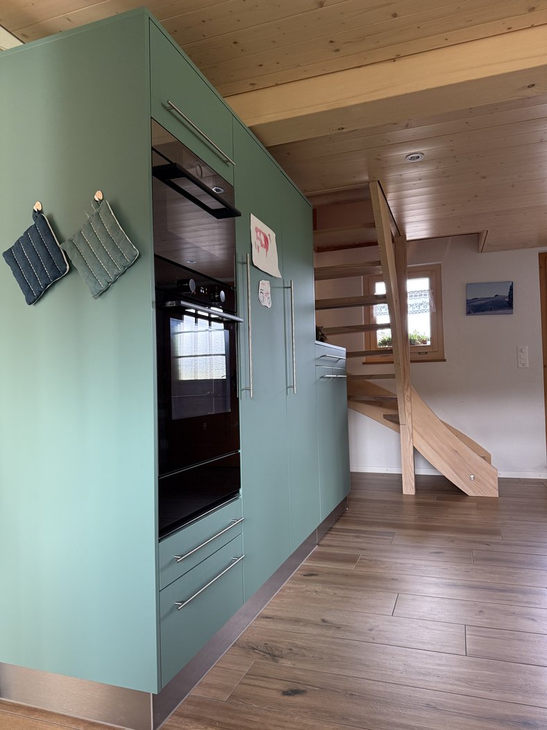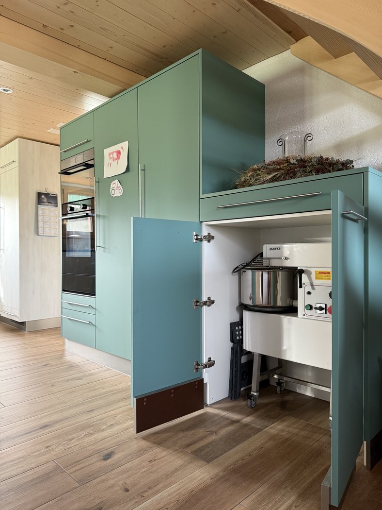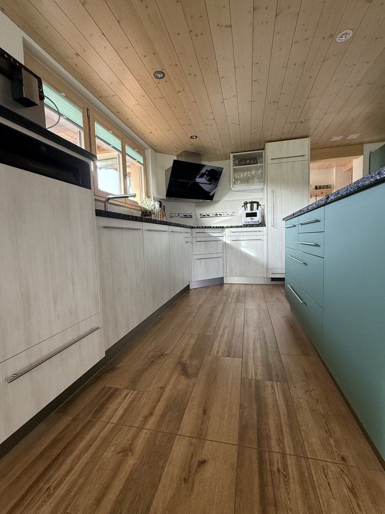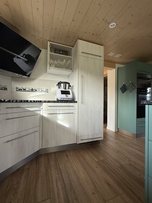 Eine Küche ohne Grenzen - zweifarbig designt, perfekt ausgestattet mit Extra-Brotbackofen, erhöhtem Geschirrspüler, einem Eckkochfeld, grosszügigen Hochschränken, einer stilvollen Bar und einem speziellen Schrank für die XXL-Küchenhilfe.