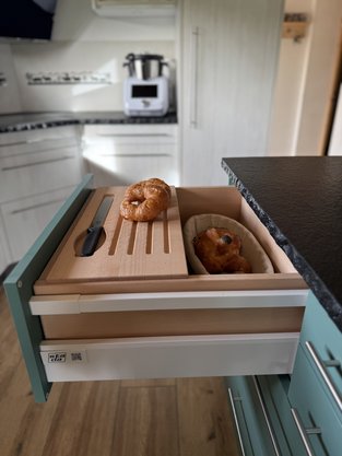 Ach ja, beim Öffnen der Schubladen zeigen sich weitere Details - wie zum Beispiel der integrierte Brotkasten. Lassen Sie sich inspirieren.