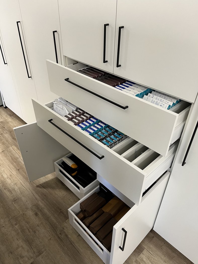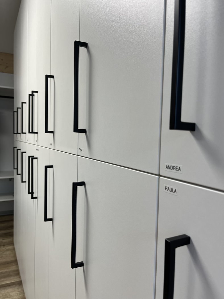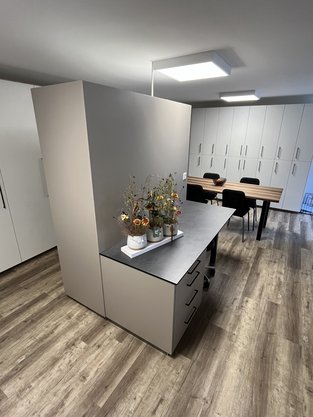 Ob kleiner oder grosser Schrank oder alternativ Schubladen - in diesem Aufenthaltsraum mit integrierter Teeküche der zugleich als Lager dient, zeigen sich die unterschiedlichen Facetten der Stauraumlösungen.