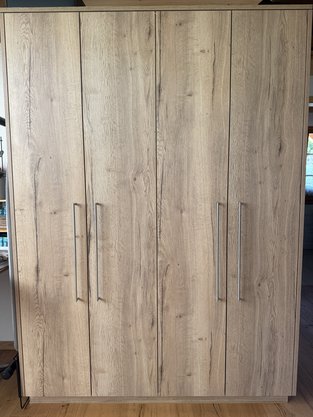 Schränke überzeugen nicht nur unter Dachschrägen, sondern eignen sich auch hervorragend als stilvolle Raumtrenner, wie hier der Hochschrank aus Eichen-Optik.