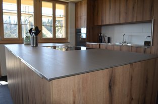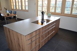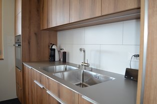 Das Hightlight dieser Küche ist die Arbeitsplatte aus Edelstahl sowie die zwei Spülbecken - eine Kombination, die heute nicht mehr häuftig vorkommt.