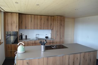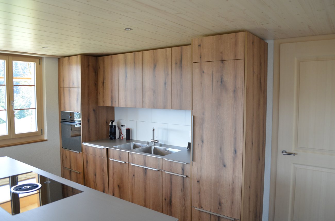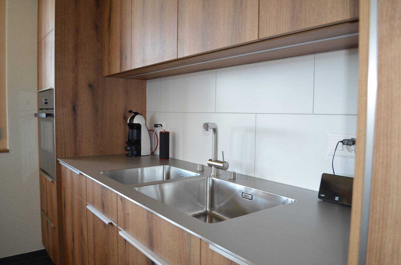 Die Cognac-Eichenfront verleiht der Küche eine warme, angenehme Ausstrahlung und bildet zusammen mit dem Edelstahl ein perfektes Gesamtbild.